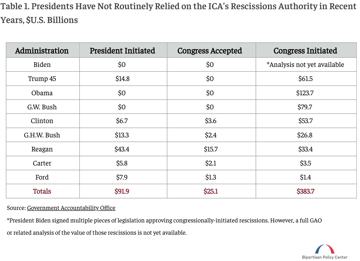 George HW Bush and Clinton both had a few rescission packages approved during their terms in office, but nothing quite like Reagan. Under George W Bush, Obama and Biden, the rescission power was kept on ice. Trump proposed a some rescissions during his first term, but none of them were approved.