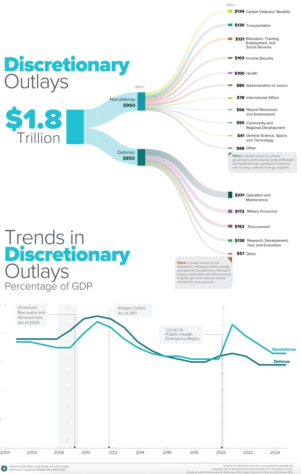 The federal budget consists of mandatory (60% of the budget in 2024), discretionary (26%) and interest outlays. Mandatory spending covers programs like Medicare, Medicaid and Social Security. Meanwhile discretionary spending is laid out under existing laws and formally approved by Congress and the President during the annual appropriations process. Slightly less than half of discretionary spending goes toward defense, the other half is devoted to various government programs like veterans’ benefits and federal infrastructure investments.