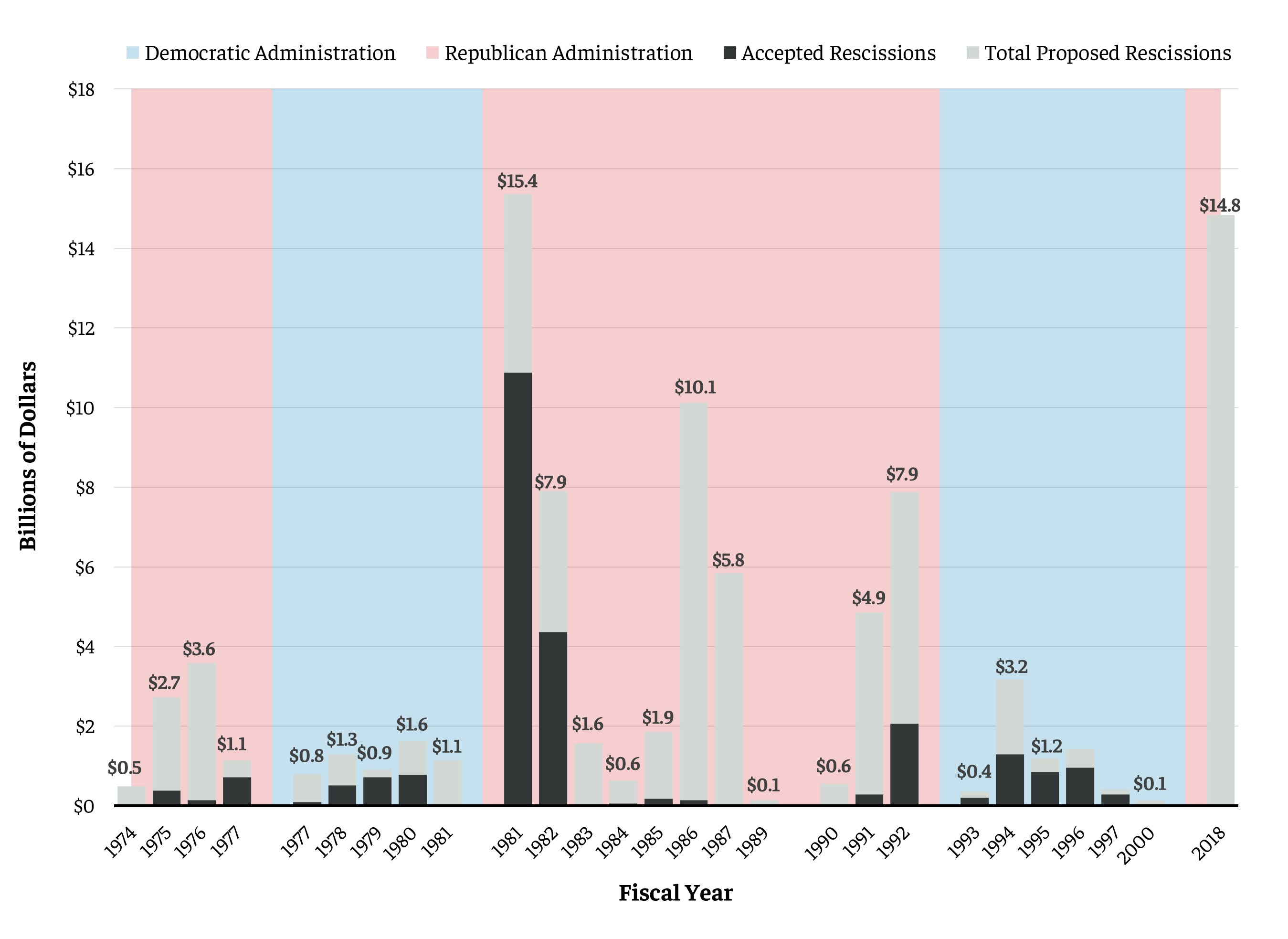 Over the past fifty years, Presidents have initiated rescissions worth a total of $92bn, the overwhelming majority of which came during the Reagan and GW Bush years. Congress approved just $25bn, and none in the 21st century (that is, until earlier this summer).