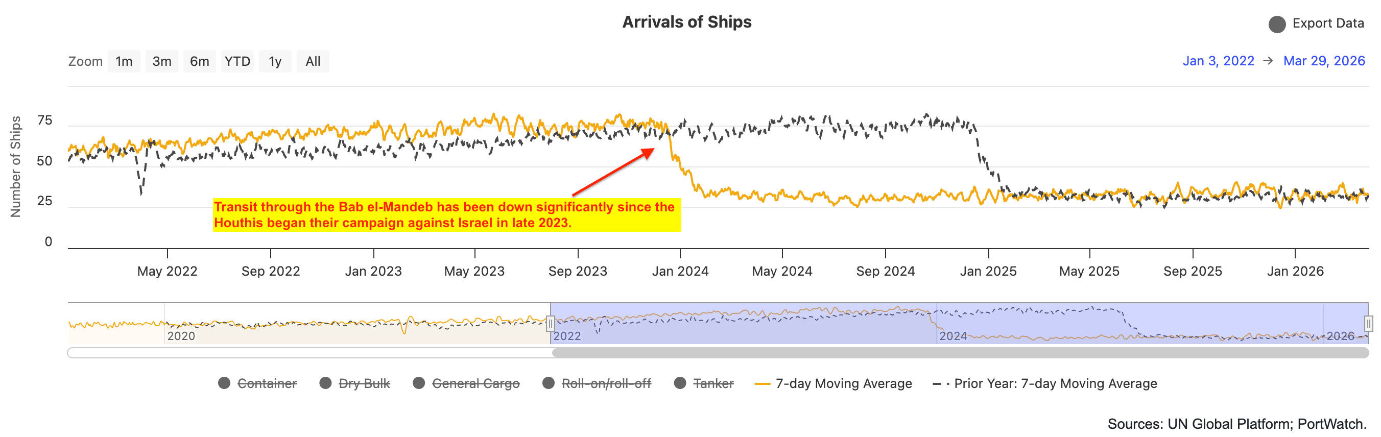 The amount of crude oil passing through the Bab el-Mandeb has increased since the start of the Iran war, but is still well below typical levels transiting through the Strait of Hormuz (~20mn b/d).