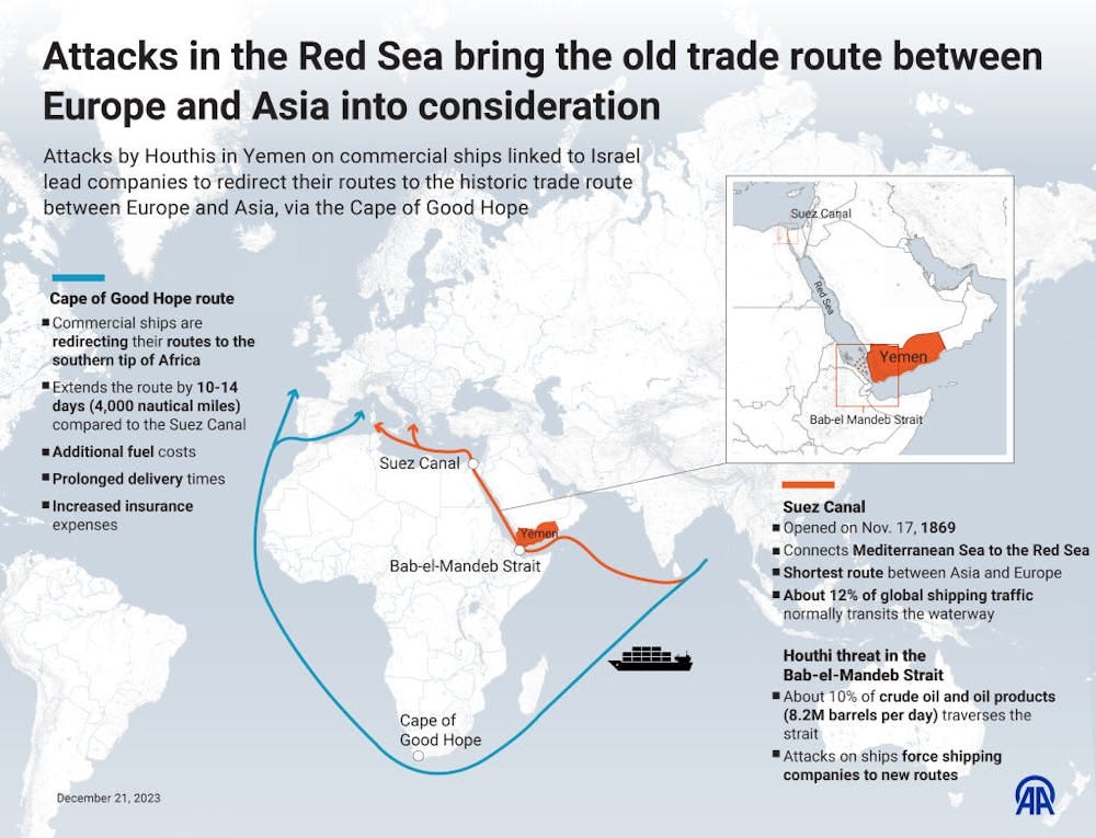 Its place as the connection point between the Red Sea (and with it, the Suez Canal, the Mediterranean, and Europe) to the Gulf of Aden (which flows to the wider Indian Ocean) makes the Bab el-Mandeb especially important for trade between Asia and Europe.