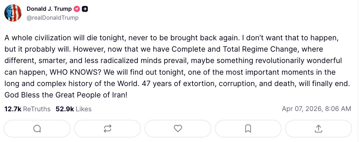 Trump didn’t follow through with his threat that “a whole civilization will die tonight”, but it is wholly unacceptable for any leader to make such a claim. In a normal world, the Cabinet (by invoking the 25th amendment) and Congress (by passing a war powers resolution followed by impeachment) would take action immediately to remove him from office.