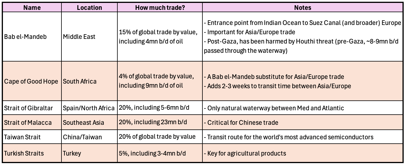 Below, we discuss six key global trade chokepoints.